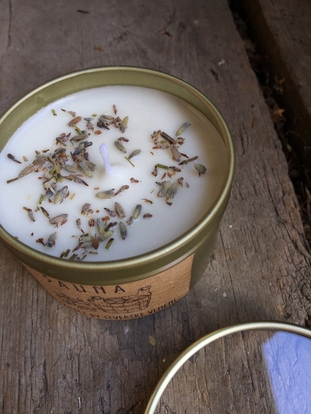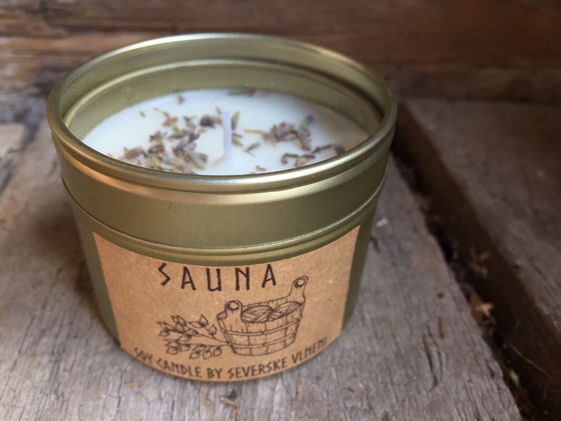 Sauna – co jiného k Finsku patří více, než saunování? Krásná relaxační saunová vůně. Výrazné tóny eukalyptu, citrusů a bylinek. Svíčka je navrchu ozdobená sušenou levandulí a třpytkami.