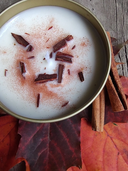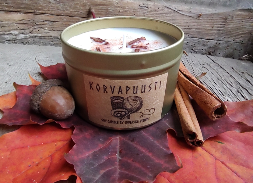 Korvapuusti – Facka přes ucho? Kdepak, nejlahodnější skořicové rolky se špetkou vanilky a kardamonu - esence podzimního pletení a must-have při každé kávě ve Finsku. (Korvapuusti doopravdy znamená "facka přes ucho" - díky tradičnímu tvaru tohoto sladkého pečiva.) Svíčka je navrchu ozdobená kousky skořice a třpytkami.