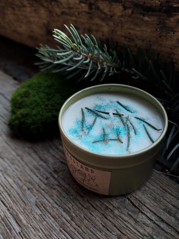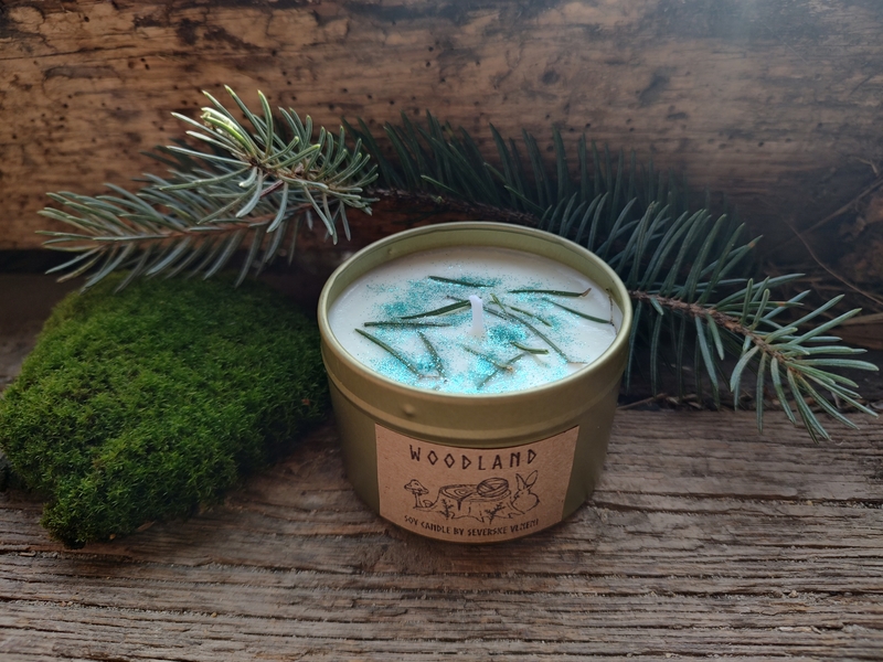 Woodland – to je klasika, nekonečné severské lesy, vůně cedru, jalovce a borovic. Vůně, u které vznikl nápad na severské svíčky. Svíčka je navrchu ozdobená jehličím a třpytkami.