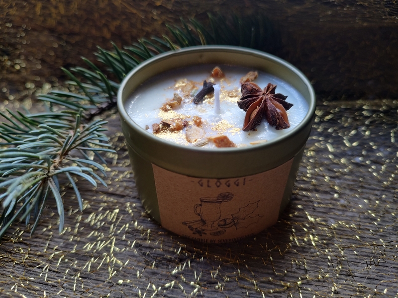 Glöggi - ano, hádáte správně - to je severský svařák! Tato svíčka má nádherně harmonickou vůni vánočního koření - mezi hlavními tóny jde cítit pomeranč, hřebíček a badyán a také kapka skořice a kardamonu! A ozdobená je zrovna tak - vánočním kořením a špetkou zlatých třpytek.