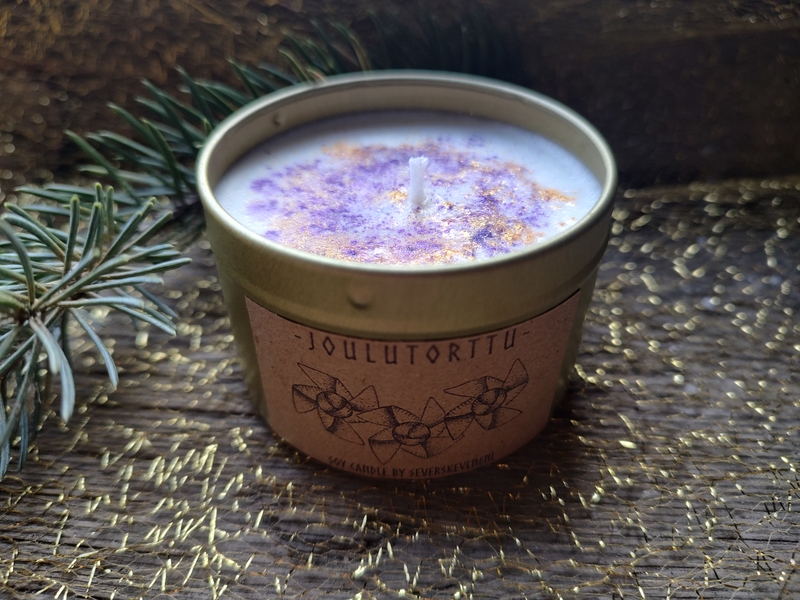 Joulutorttu - to je finské tradiční vánoční pečivo z listového těsta a švestkové marmelády - a tato svíčka voní přesně tak - sladce po švestkách a vanilce ♥ zamilujete si jí! Ozdobená je zlatými a fialovými třpytkami.